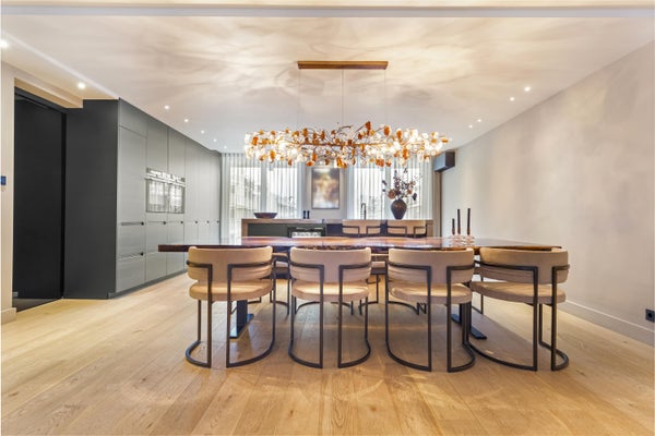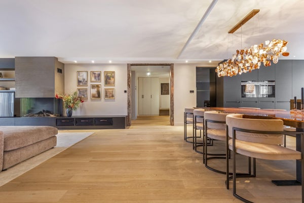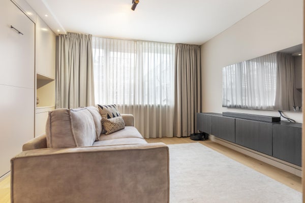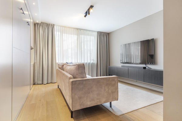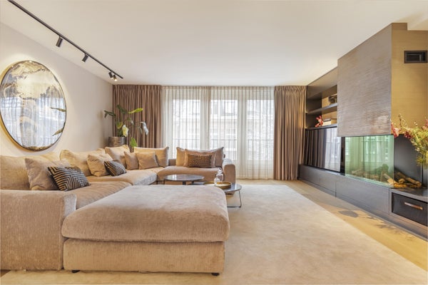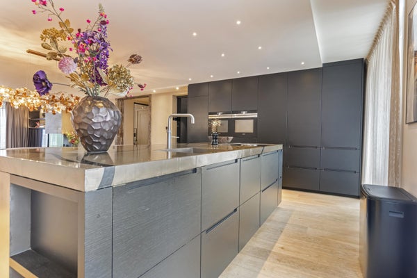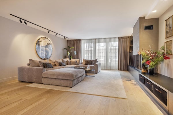 De woonkamer is ruim opgezet en vormt samen met de open keuken een stijlvolle leefruimte. De keuken sluit naadloos aan op het woondeel en is uitgevoerd op hoog niveau, passend bij het luxe karakter van de woning. Grote openslaande deuren verbinden de leefruimte met het balkon, waardoor binnen en buiten moeiteloos in elkaar overlopen.