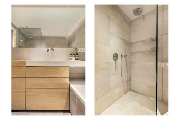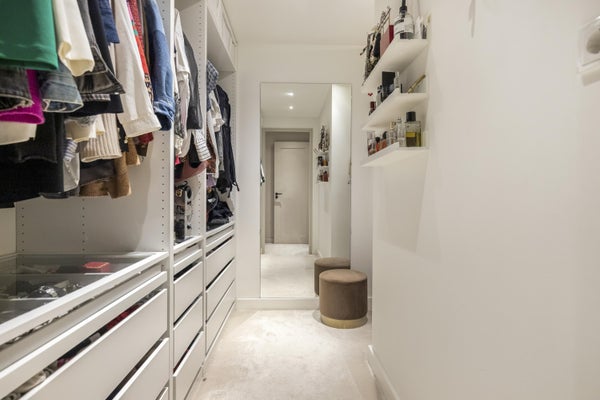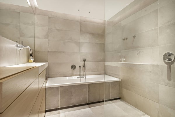 De badkamer is compleet uitgevoerd met ligbad en separate douche. Daarnaast is er een apart toilet en zijn er meerdere vaste kasten aanwezig, wat zorgt voor opvallend veel bergruimte en een opgeruimd woongevoel.