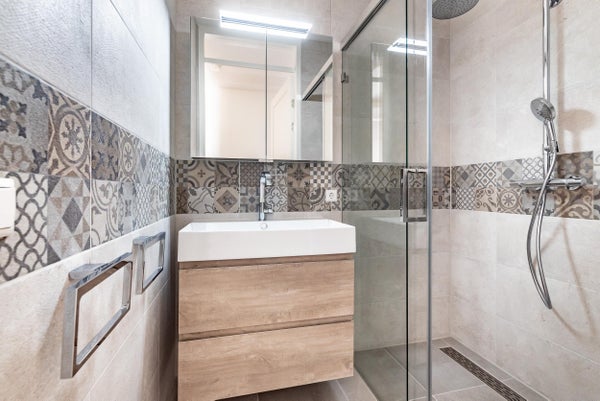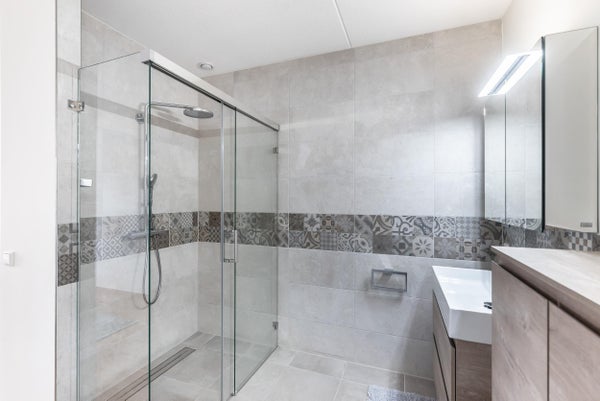Aan de achterzijde bevinden zich 3 slaapkamers waarbij voor 2 slaapkamers een extra badkamer is gesitueerd die vanuit beide kamers makkelijk te bereiken is. De masterbedroom is gekoppeld aan een grote badkamer met een dubbele wastafelmeubel en een douche. Vanuit de douche stap je zo je bed in.