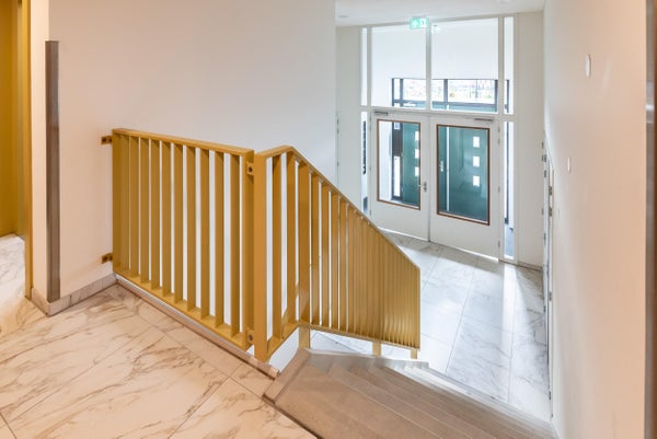 De entree bevindt zich op de derde verdieping van het gebouw. De entree geeft toegang tot alle vertrekken, een inpandige berging met wasmachine en een apart toilet.