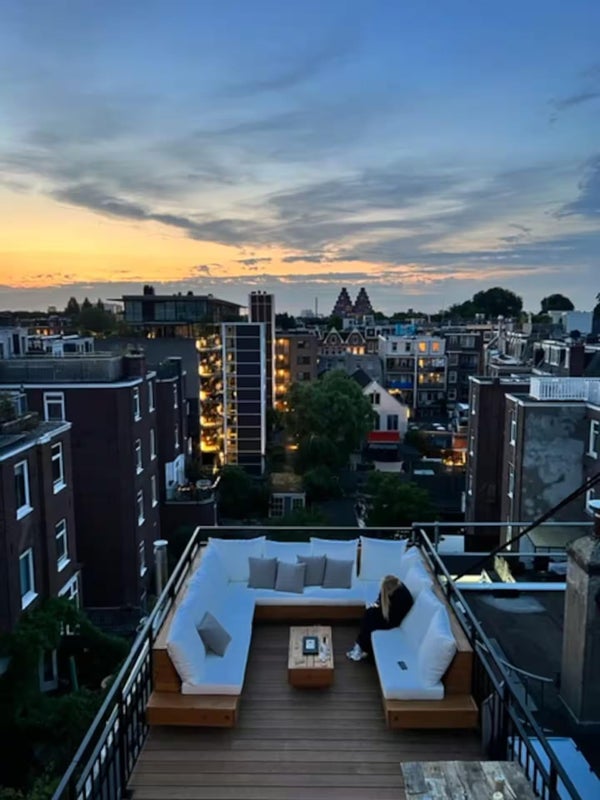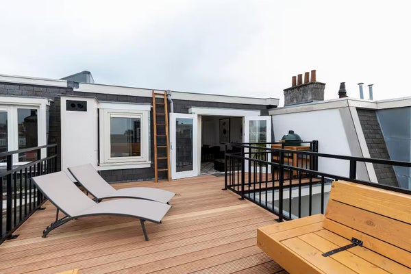 Het absolute hoogtepunt is het dakterras van 30 m² met de hele dag zon – van zonsopkomst tot zonsondergang. Voor kookliefhebbers staat er zelfs een Big Green Egg klaar. Via de trap is ook het dak van het pand zelf bereikbaar, vanwaar je een spectaculair uitzicht hebt over heel Amsterdam.