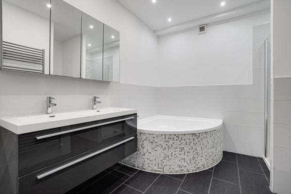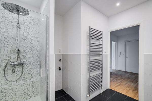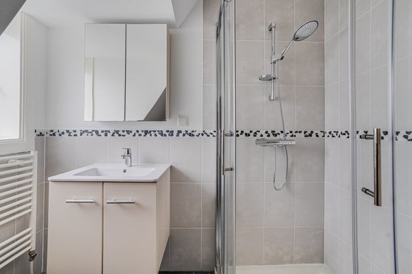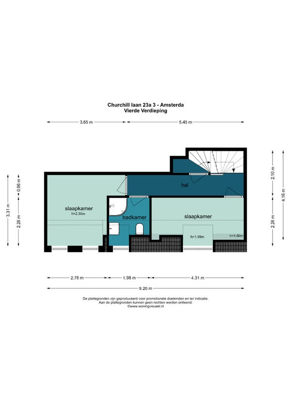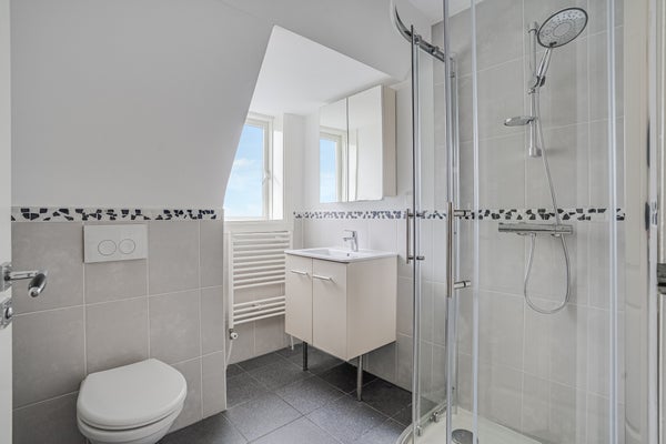 Vierde verdieping: Hier bevinden zich aan de voorkant twee slaapkamers gescheiden door een tweede badkamer voorzien van een wastafel, douche en toilet.