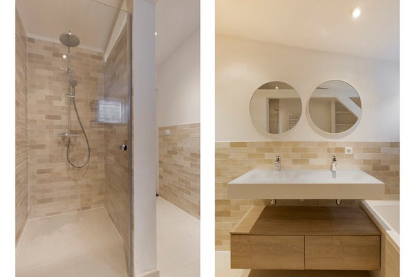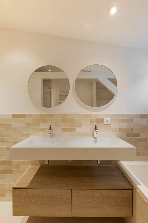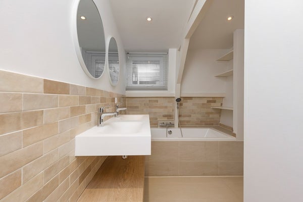 De badkamer is modern, gerenoveerd en heeft een mooi bad, een aparte douche en een wastafel.