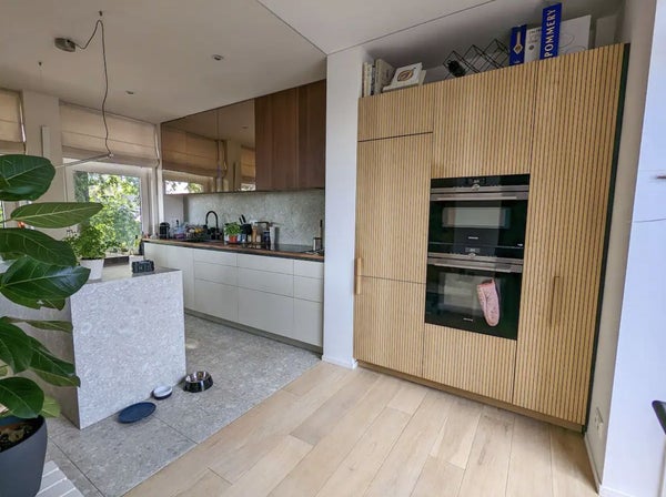 Het appartement biedt een ruime, lichtvolle woonkamer die is ontworpen met aandacht voor detail en hoogwaardige materialen door het hele appartement. De moderne designkeuken, uitgerust met inductiekoken, integreert stijl en functionaliteit naadloos—ideaal voor zowel dagelijks gebruik als entertainment.