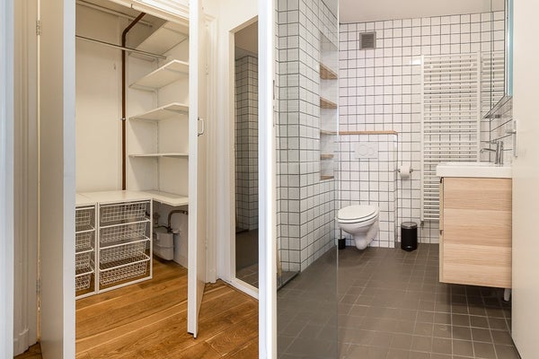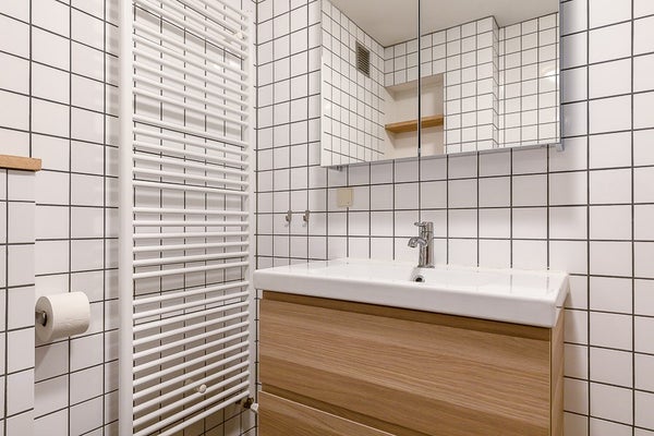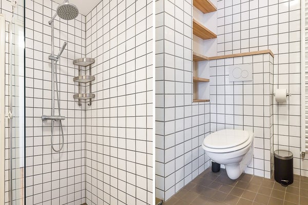 Geheel moderne betegelde badkamer met douche, wastafel, radiator en toilet