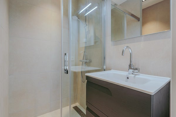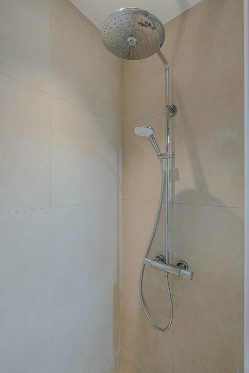 - Badkamer met badkuip en inloopdouche