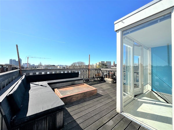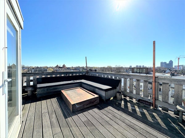 Indeling: Trap naar de tweede etage. Zeer ruime woon-/eetkamer met aan de achterzijde de open keuken. De keuken is voorzien van een koelkast, vriezer, oven, vaatwasser en een gaskookplaat met afzuigkap. Openslaande deuren die toegang bieden tot het balkon gelegen op het Zuiden. Vanuit de hal toegang tot een kleine slaapkamer of kantoor. Separaat toilet. Trap naar de volgende verdieping waar de overige 3 slaapkamers zich bevinden en de badkamer voorzien van een dubbele wastafel en een inloopdouche. Tweede separaat toilet. Vanuit de hal trap naar het heerlijke ruime dakterras met fraai uitzicht over de stad.