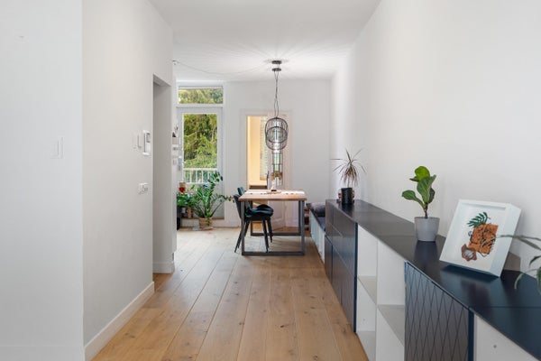 Op de eerste woonlaag (tweede verdieping) bevindt zich een ruime woonkamer met drie grote, dubbel beglaasde ramen en een moderne keuken met eethoek — ideaal om te koken en te genieten met gezelschap. Daarnaast is er een aparte kamer die perfect kan dienen als thuiskantoor, een toilet en een klein balkon.