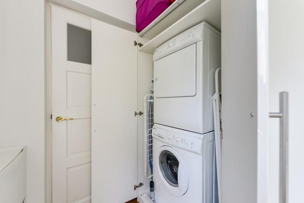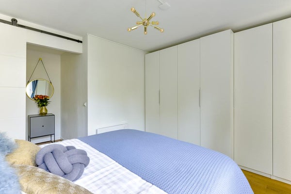 Een open trap leidt naar de derde verdieping. Hier vind je een ruime master bedroom met een kastenwand en toegang tot het tweede balkon. De tweede slaapkamer wordt momenteel gebruikt als kleedkamer. Daarnaast is er een praktische bergkast met wasmachine en droger.