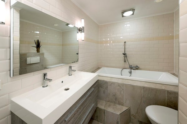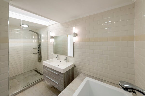 Luxe badkamer met ligbad, inloopdouche, tweede toilet en dubbele wastafel.