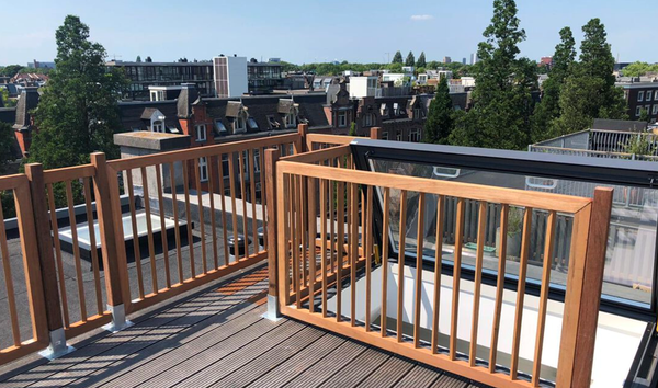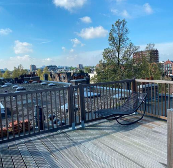 Vanuit de entreehal leidt een trap naar het privé-dakterras, dat een prachtig panoramisch uitzicht over de stad biedt - inclusief de Westertoren, Rijksmuseum, en Vondelpark.