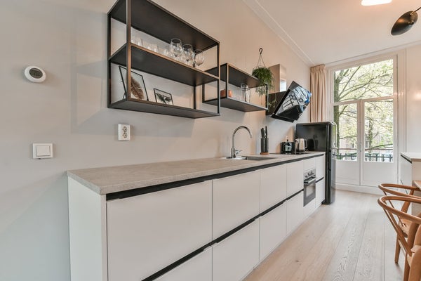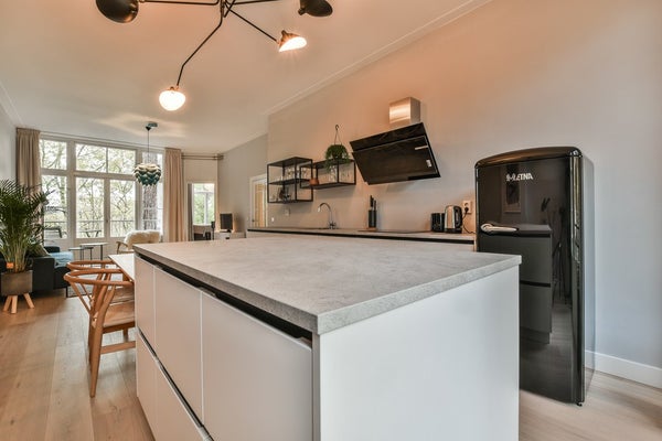 De moderne keuken heeft een lichte kleurstelling en heeft een kookeiland. Daarnaast is de keuken voorzien van hoogwaardige inbouwapparatuur, waaronder een oven, magnetron, vaatwasser, inductiekookplaat, afzuigkap en een koelkast met vriezer.