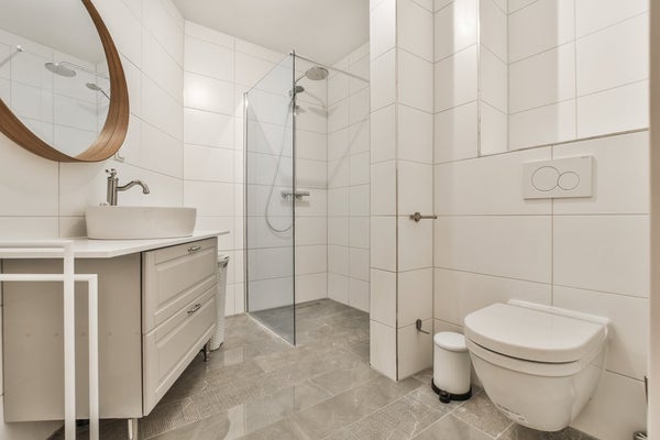 De moderne, centraal gelegen badkamer is recentelijk gerenoveerd en bevindt zich in het midden van het appartement en is voorzien van een inloopdouche, wastafel en zwevend toilet.