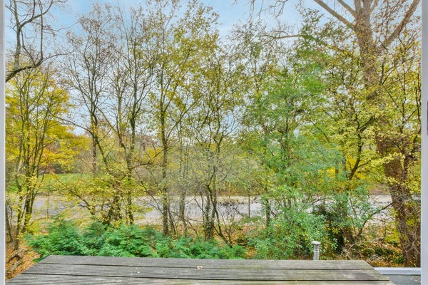 Aan de achterzijde bevindt zich het grote balkon. Dit balkon is te betreden via openslaande deuren en heeft direct uitzicht op het Vondelpark.