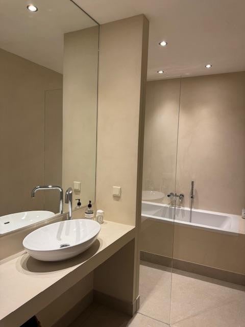 - Moderne badkamer met inloopdouche en ligbad, apart toilet en aparte wasruimte met was-droogcombinatie.