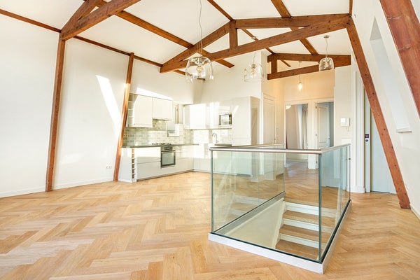 Zeer ruime en lichte woonkamer met open keuken aan de achterzijde gelegen. De gehele glazen pui aan de achterzijde kan worden geopend en biedt schitterend uitzicht. Keuken voorzien van alle benodigde inbouwapparatuur. 2 slaapkamers van goed formaat aan de voorzijde gelegen. Badkamer voorzien van bad, douche en wastafel. Separaat toilet. Separate ruimte voor wasmachine/droger. Door de gehele woning ligt een mooie visgraat parketvloer. Werkelijk alles is tot in de details hoogwaardig afgewerkt.