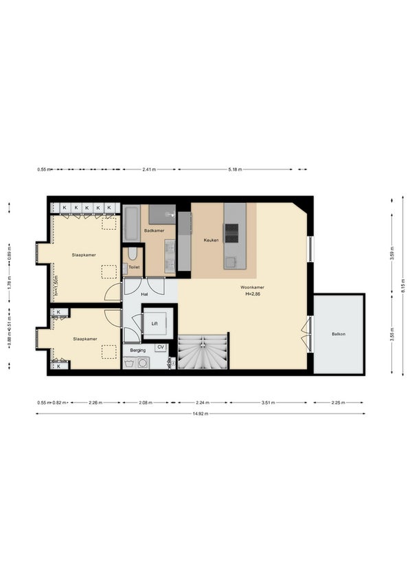 • Twee slaapkamers (1 groot en 1 middelgroot)