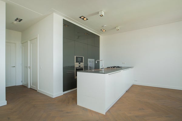 Entree: direct vanuit de lift het huis in stapend, wordt u begroet door een ruime woonkamer met een breedte van 7,50 meter en uniek hoge plafonds van 3 meter. Franse deuren leiden naar een balkon met uitzicht op de binnentuinen. De stijlvolle open woonkeuken beschikt over een eiland en is uitgerust met luxe inbouwapparatuur, waaronder een vaatwasser, een combimagnetron, een wijnkoeler en een 4-pits gasfornuis, die de keuken compleet maken. Een vaste trap leidt naar de daktopstructuur, vanwaar u toegang heeft tot het uitgestrekte dakterras (ongeveer 45m2) met veel opslagruimte.