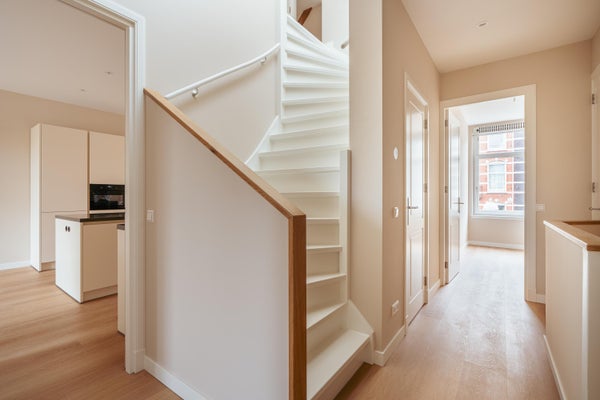 Het appartement is bereikbaar via een gemeenschappelijke entree, met een eigen opgang op de eerste verdieping met ruime trapkast. De woning strekt zich uit over de tweede en derde — tevens bovenste — verdieping van het pand.