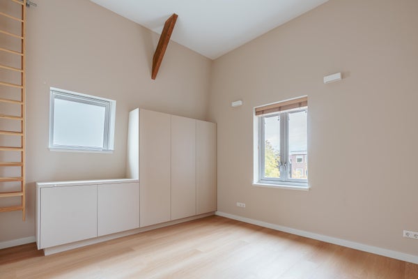 Via de overloop, waar zich een separaat gastentoilet bevindt, zijn alle vertrekken op deze verdieping toegankelijk. Aan de linkerzijde bevinden zich twee goed bemeten slaapkamers. Aan de rechterzijde ligt de royale doorzonwoonkamer, die dankzij de grote raampartijen rijkelijk wordt overspoeld met daglicht. De stijlvolle open keuken is uitgevoerd in een strak en luxe design en uitgerust met alle denkbare inbouwapparatuur, waaronder een kookeiland, combi-oven, vaatwasser, koel-vriescombinatie en volop bergruimte. De originele schouw voegt een warm, authentiek accent toe aan het geheel. Via openslaande deuren heeft u toegang tot het dakterras (ca. 32 m²): een heerlijke plek om buiten te ontspannen.