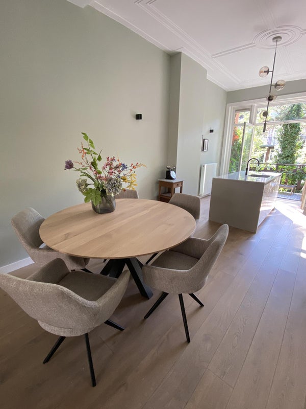 De royale woonkamer biedt voldoende ruimte voor een gezellige zithoek én een eethoek. De open keuken is voorzien van een kookeiland met zitgedeelte, veel opbergruimte en moderne inbouwapparatuur zoals een Siemens stoomoven, Boretti kookplaat, Quooker en vaatwasser.