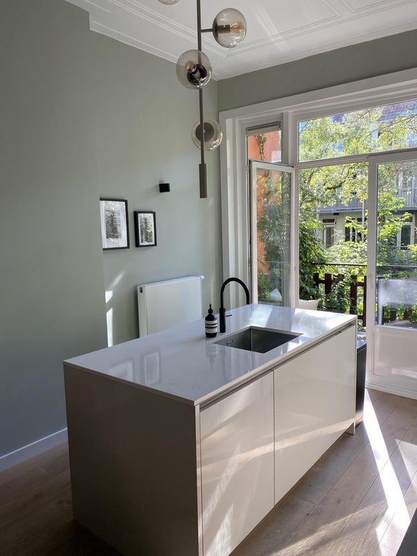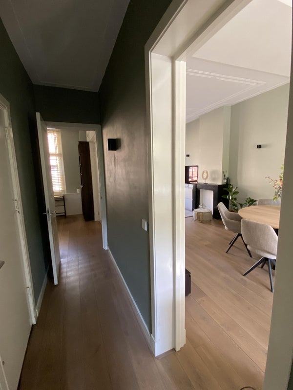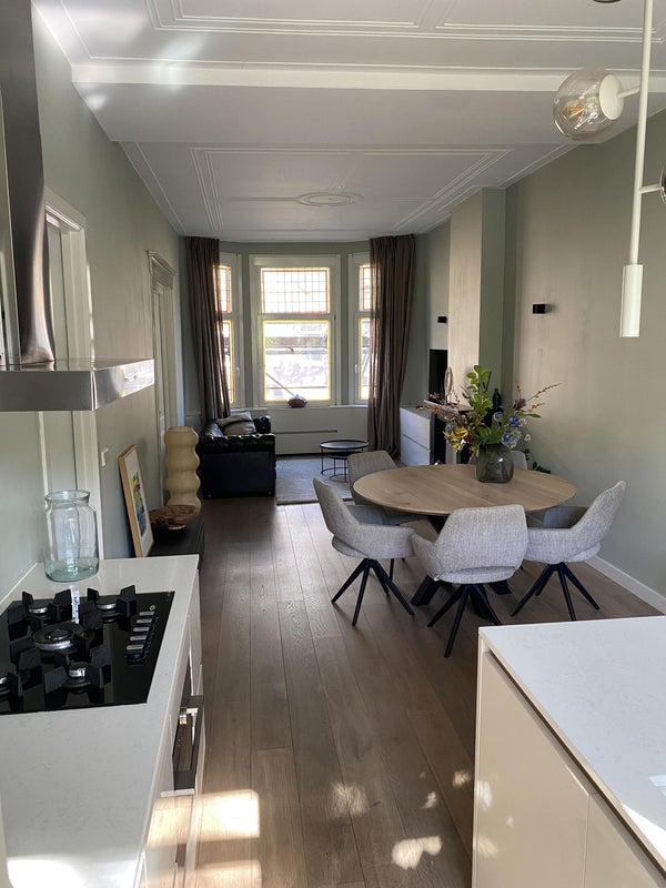 Bij binnenkomst valt direct de prettige sfeer op die de woning uitstraalt. De hoge plafonds met originele ornamenten en de grote raampartijen zorgen voor veel licht en een ruimtelijk gevoel.