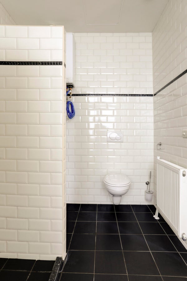 Indeling; entree op de eerste verdieping, kleine hal met apart toilet, grote woonkamer met basis keuken in het midden, slaapkamer met enorm privéterras aan de achterkant en een zeer ruime badkamer incl. bad en douche, wasmachine en droger. Ideaal voor een alleenstaande of een stel.