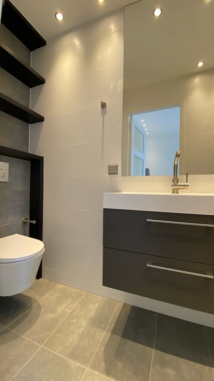 Voorkant, woonkamer met open keuken met alle inbouwapparatuur, grote ramen die veel natuurlijk licht in het appartement laten. Via de hal naar de achterzijde, badkamer met douche, wastafel en toilet. Slaapkamer ruim genoeg voor een tweepersoonsbed en inbouwkasten. Aan de achterzijde, tweede slaapkamer met en-suite badkamer met douche, wastafel en tweede toilet. Separaat wasruimte.