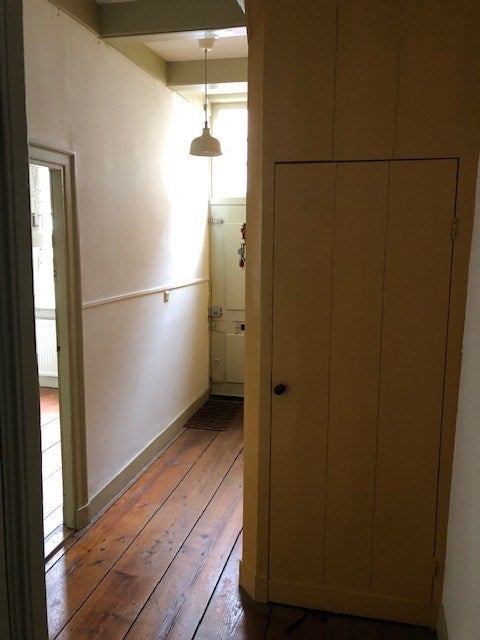 Met een kleine trap kom je de via een eigen entree in de hal met garderobekast. De hal geeft toegang tot de aparte keuken, de woonkamer , het separate toilet en de trap naar de tweede verdieping.