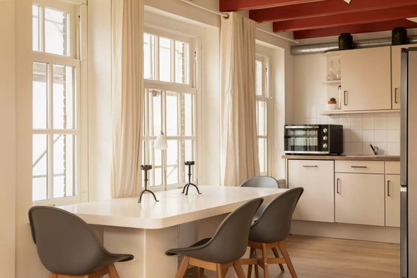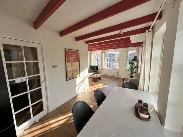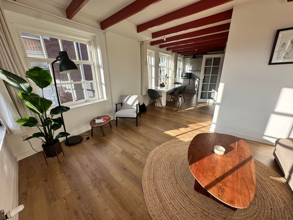 Omschrijving appartement Het appartement heeft een totale woonoppervlakte van circa 88 m², verdeeld over twee verdiepingen. Bij binnenkomst op de derde verdieping betreed je een ruime en lichte woonkamer met grote ramen die uitzicht bieden op de schilderachtige Oudeschans. De ruimte is sfeervol ingericht met moderne meubels en een warme houten vloer. De open keuken is voorzien van inbouwapparatuur, waaronder een vaatwasser, oven, inductiekookplaat en een koelkast met vriesvak. De keuken biedt voldoende opbergruimte en is afgewerkt met stijlvolle kastfronten en een strak werkblad. Via de trap bereik je de vierde verdieping. De ruime overloop op deze verdieping biedt een ideale werkplek. Hier vind je ook de badkamer, twee slaapkamers waarvan één is voorzien met een comfortabel tweepersoonsbed, ingebouwde kasten en dakramen die zorgen voor veel natuurlijk licht.
