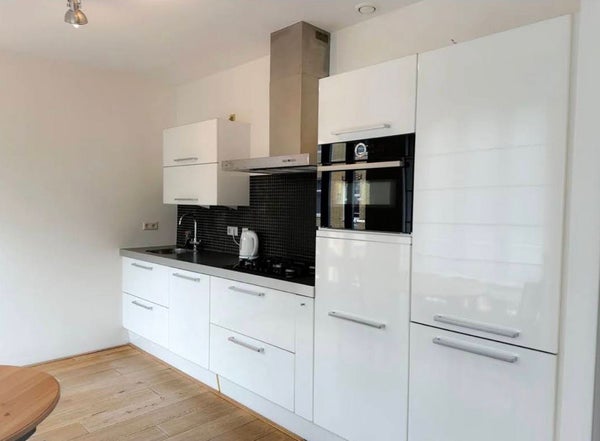 De lichte woonkamer aan de voorkant biedt een comfortabele zit- en eetruimte met grote ramen die veel natuurlijk licht binnenlaten. De open keuken is modern en volledig uitgerust met inbouwapparatuur.
