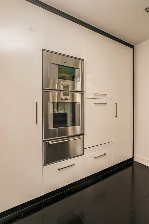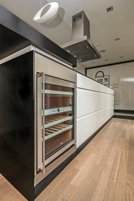 Volledig uitgeruste open keuken met oven, stoomoven, aparte moderne wijnkoelkast, vaatwasser, koelkast en vriezer.
