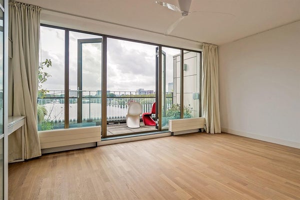 Lichte en ruime woonkamer met dubbele deuren naar het terras dat een spectaculair uitzicht biedt over het water van de Westlandgracht.