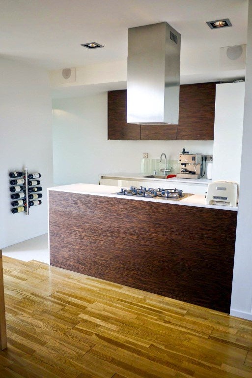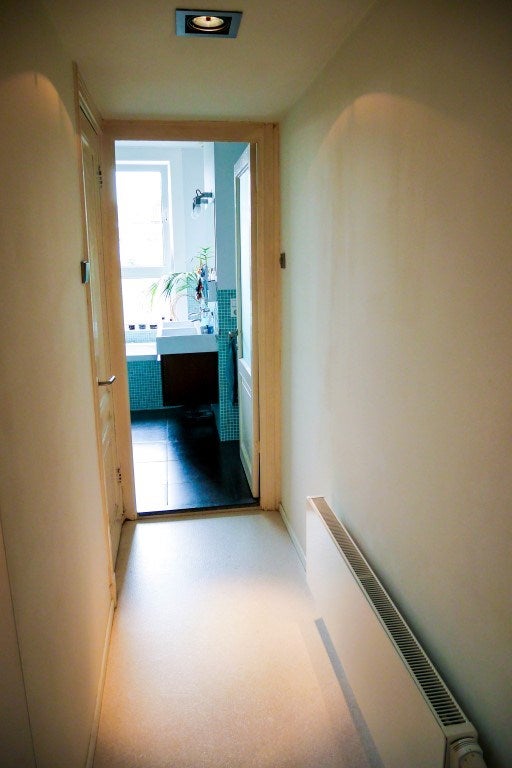 Centrale entree met intercom en trap naar de hogere verdiepingen. Toegang tot het appartement op de derde verdieping. Toegang tot de ruime woonkamer met een houten parketvloer en een balkon. De open keuken is voorzien van diverse inbouwapparatuur, waaronder een vaatwasser, een combi-oven/magnetron, een koel-vriescombinatie en een 5-pits gasfornuis met afzuigkap.