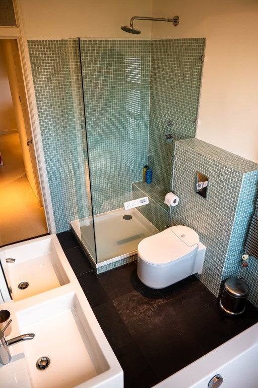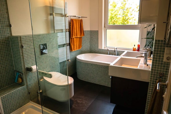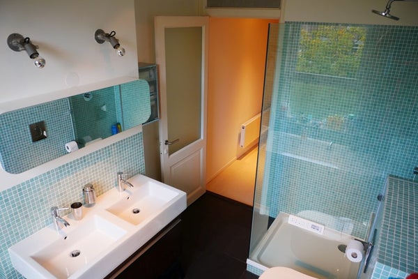 De volledig gerenoveerde en moderne badkamer beschikt over een badkuip, een aparte douche met regendouche, een toilet en een dubbele wastafel.