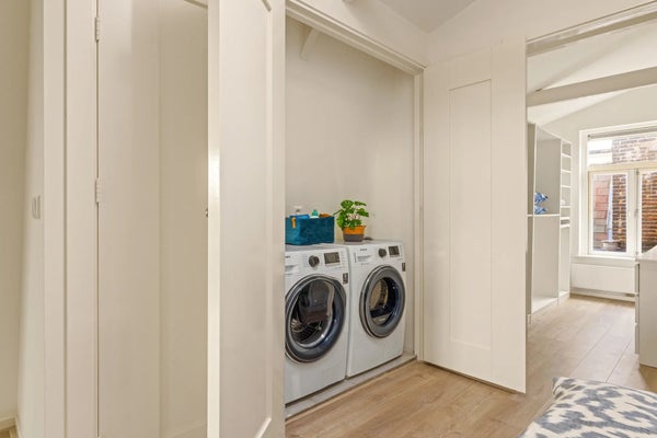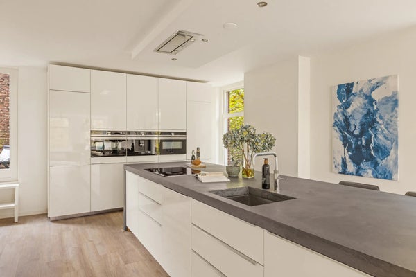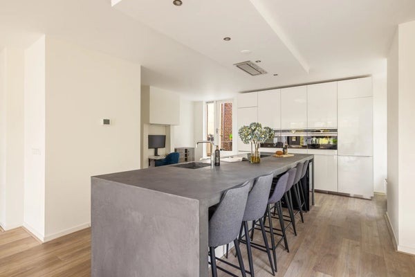 De derde verdieping vormt het sociale hart van het huis: een lichte woonkamer met grote ramen aan beide zijden. Aan de voorzijde kijkt u uit over de gracht, aan de zijkant over het park, en aan de achterzijde nodigt het zuidwestgerichte balkon uit om in de middagzon te eten of te ontspannen. De strakke witte keuken is zowel stijlvol als praktisch, met een groot kookeiland en barzitplaatsen voor zes personen. De keuken is volledig uitgerust met Siemens-apparatuur, waaronder twee ovens, een ingebouwd koffieapparaat, inductiekookplaat, Quooker-kraan, vaatwasser en koel-vriescombinatie. Een MOA-wijnklimaatkast en ruime opberglades maken de ruimte compleet. Op deze verdieping bevindt zich tevens een gasten-WC met een kleine wastafel.