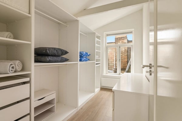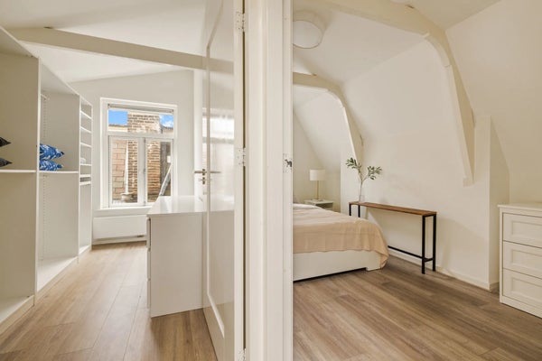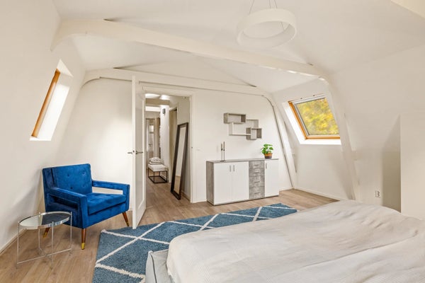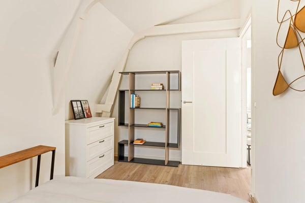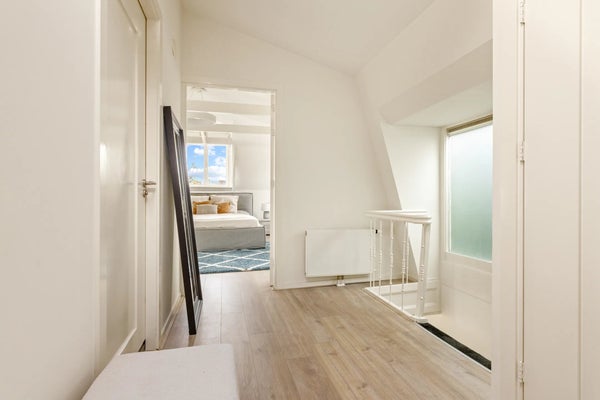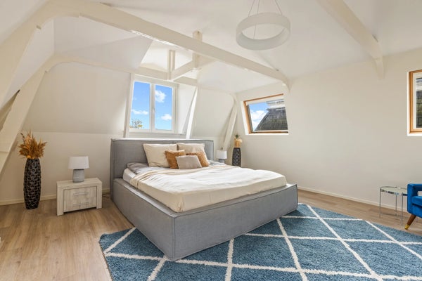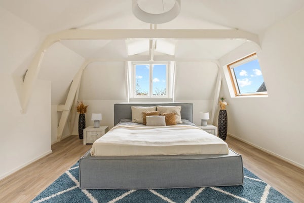 Een trap met klassieke spijlen leidt naar de bovenste verdieping, waar veel licht binnenvalt via twee grote ramen en een dakraam. Hier bevinden zich drie comfortabele slaapkamers, een waskast met aansluiting voor wasmachine en droger, en de cv-installatie. De hoofdslaapkamer is ruim en sfeervol, met zichtbare balken en ramen aan drie zijden. De twee slaapkamers aan de achterzijde zijn rustig en knus, waarvan één momenteel als inloopkast wordt gebruikt.