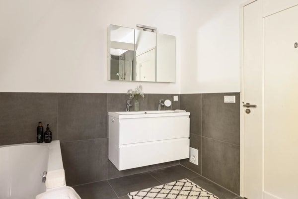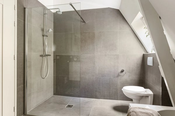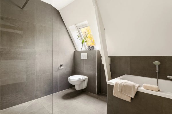 De badkamer is ruim en smaakvol afgewerkt met grote antracietkleurige tegels. Er is een inloop-regendouche, dubbel wastafelmeubel, toilet en een vrijstaand bad — de ideale plek om te ontspannen op koude dagen. Een raam zorgt voor natuurlijke ventilatie en lichtinval.