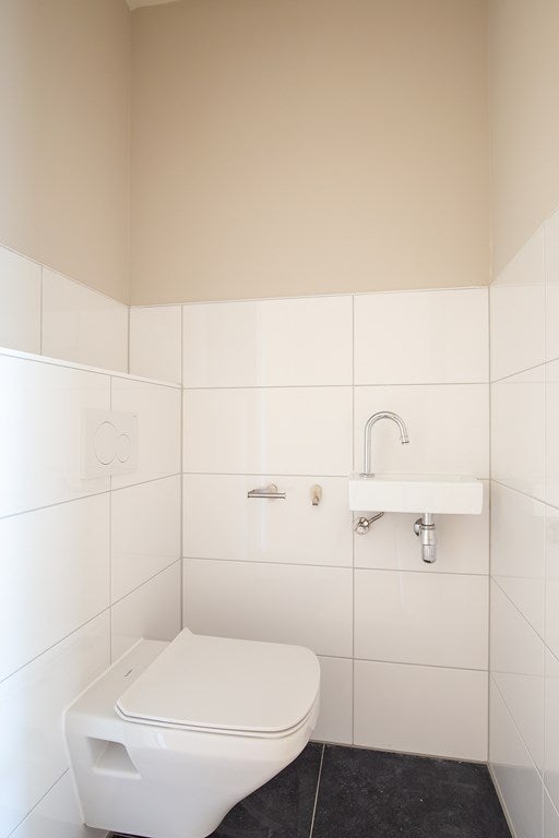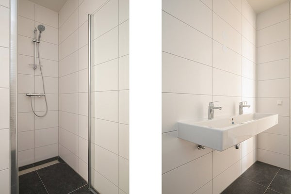 De badkamer (ca. 2,92 x 2,40 = 7,00m2) heeft ligbad en inloopdouche. Het toilet is apart.