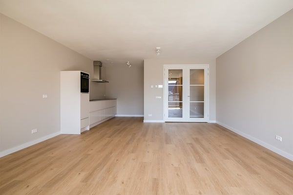 Aan de oostzijde is de woonkamer (ca. 10,82 x 5,15 = 55,72m2) met balkon die geheel opengaat en de open keuken voorzien van inductie kookplaat, oven, koel / vriescombinatie en vaatwasser.