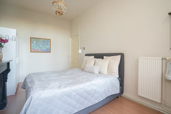 De woning beschikt over twee ruime slaapkamers, waarvan de primary gelegen is aan de achterzijde van het pand. De tweede slaapkamer aan de voorzijde is op dit moment ongemeubileerd en perfect in te richten als werk- of kinderkamer. De klassieke badkamer beschikt over een bubbelbad, inloopdouche, wastafelmeubel. In de hal bevindt zich een separaat toilet, tevens heeft de woning een wasmachine en droger.