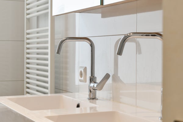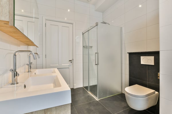 Aan de achterzijde van het pand bevinden zich de drie goed bemeten slaapkamers . De badkamer is uitgerust met een dubbele wastafel met meubel, inloopdouche, handdoek radiator, toilet en wasmachine.