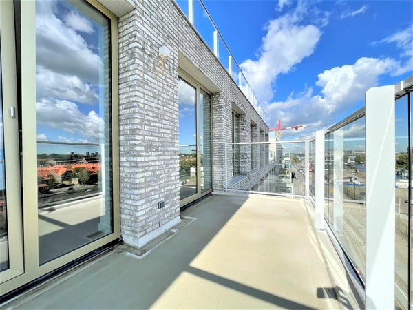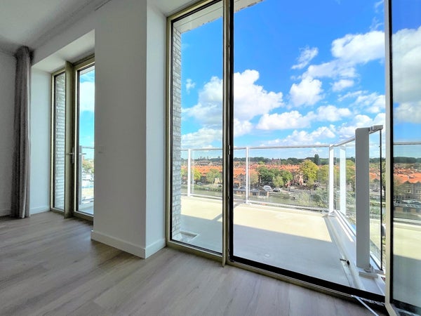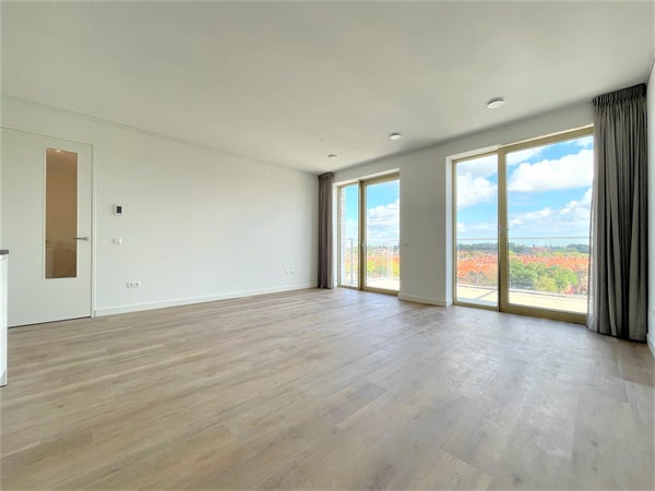 Indeling: Zeer fraaie centrale entree met lift naar de vijfde etage. Hal met toegang tot alle vertrekken. Riante woonkamer met grote raampartijen die zorgen voor zeer veel lichtinval en toegang bieden tot het ruime balkon met prachtig uitzicht. Luxe open keuken voorzien van alle benodigde inbouwapparatuur, waaronder een koelkast met vriesvak, vaatwasser, kraan met Quooker, combi-oven en een inductiekookplaat met afzuigkap. Vanuit de hal toegang tot de twee ruime slaapkamers. Separate toiletruimte en een badkamer die is voorzien van een grote dubbele wastafel en een riante inloopdouche. Separate wasruimte met plaats voor een wasmachine en droger. Het gehele appartement is voorzien van raambekleding, vaste verlichting en een fraaie pvc vloer met comfortabele vloerverwarming.