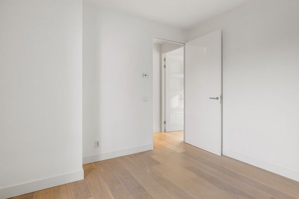 De slaapkamer is rustig gelegen en heeft eveneens veel daglicht. De badkamer is voorzien van een inloopdouche, zwevend toilet en wastafelmeubel. Daarnaast is er een aparte technische ruimte, ideaal als wasruimte of voor extra opslag.