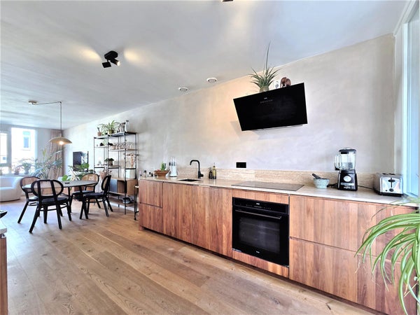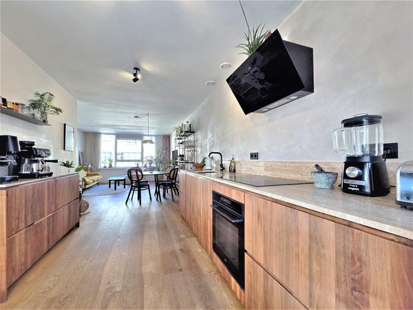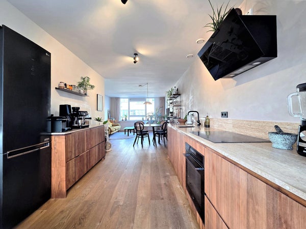 De doorzonwoonkamer is ruim en licht, met aan de voorzijde het zitgedeelte en aan de achterzijde de moderne, volledig uitgeruste keuken. Vanuit de keuken stap je direct het zonnige balkon van ca. 5m2 op het zuiden op.