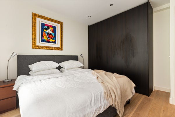 De wasmachine, droger en cv-opstelling bevinden zich in een afzonderlijke afgesloten kast. Er is een ruime badkamer met ligbad, inloopdouche en een breed wastafelmeubel. Een afgescheiden werkplek met eiken bureaublad. Grote slaapkamer aan de tuinzijde met vaste garderobekasten en openslaande deur naar de tuin/het terras. De tweede slaapkamer bevindt zich eveneens aan de achterkant en geeft ook toegang tot de tuin/het terras.