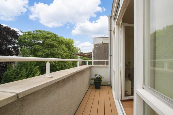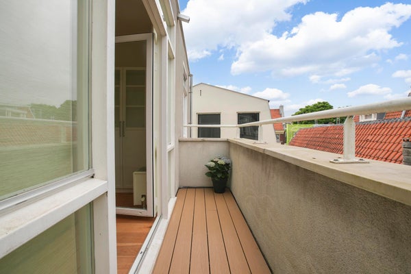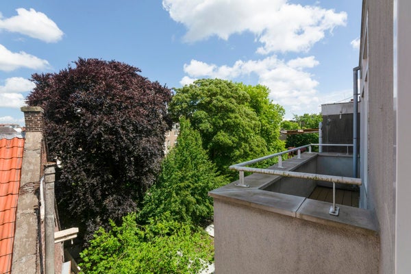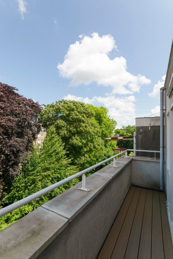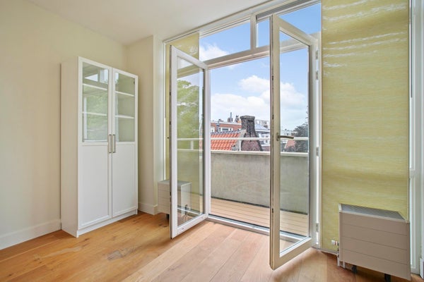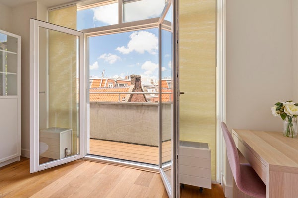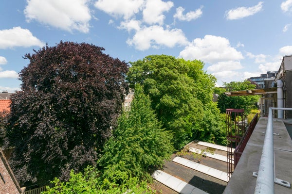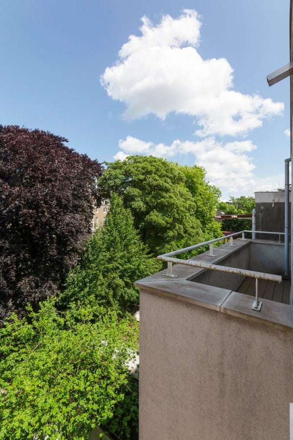 Ook het groene uitzicht op de binnentuinen van de grachtengordel vanaf het vijf meter brede balkon aan de achterzijde van het appartement in de werkkamer (tweede slaapkamer) samen met het uitzicht vanuit het raam in de slaapkamer laat niets te wensen over.