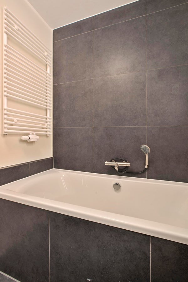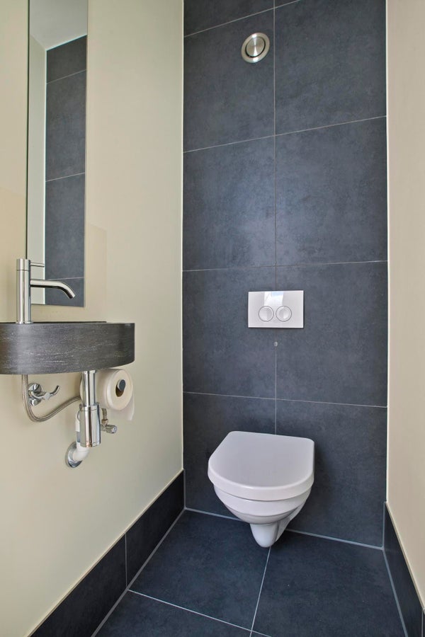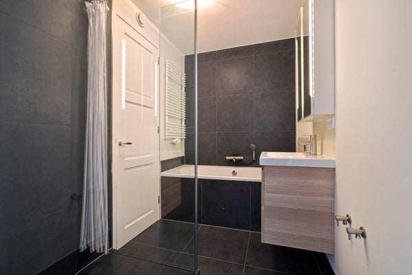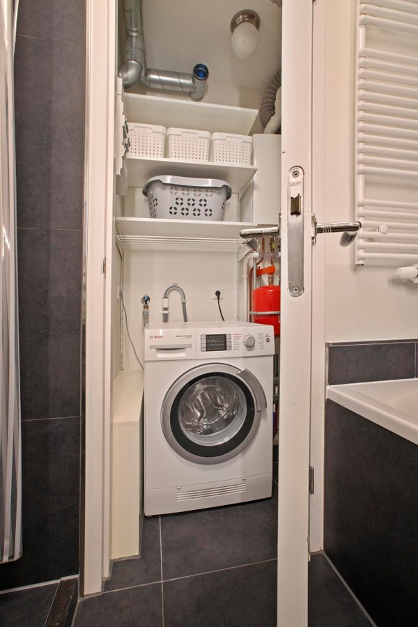 Badkamer heeft een separaat hok met een bosch wasdroog combinatie.