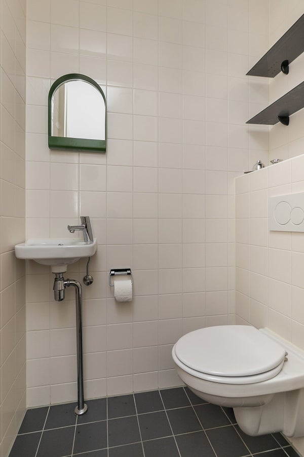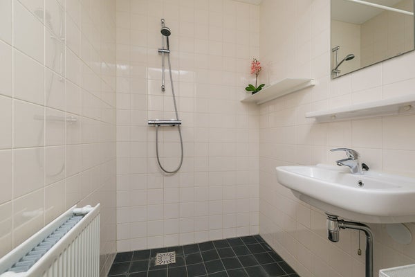 De badkamer heeft een douche en een wastafel. Er is een aparte wc.