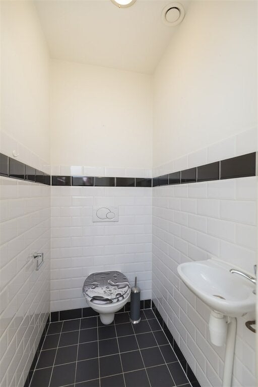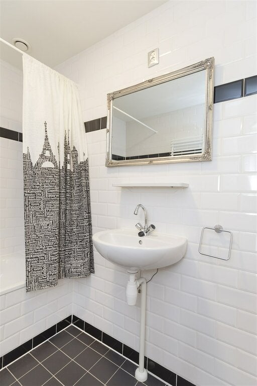 De badkamer omvat een badkuip en een wastafel, terwijl het toilet handig gescheiden is.